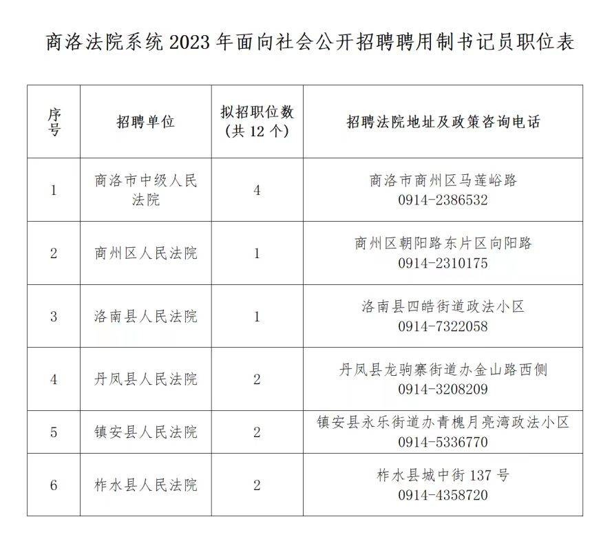 全市法院共招聘聘用制書記員12名,各法院招聘職位、地址及政策咨詢電話詳見《商洛法院系統2023年面向社會公開招聘聘用制書記員職位表》(附件)。